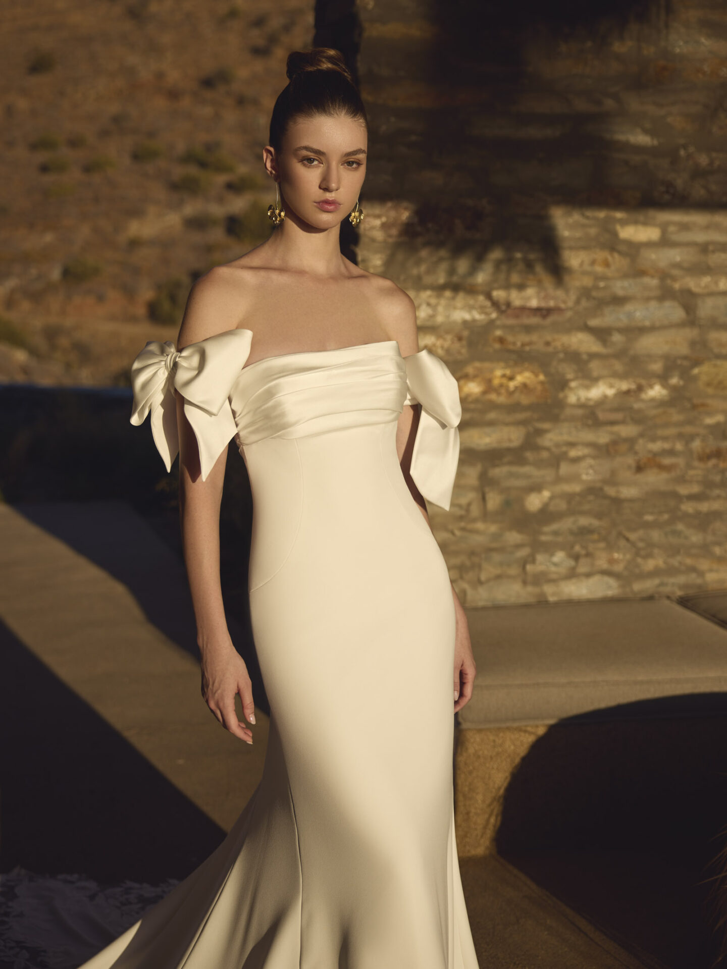 Harva ist ein wunderschönes, aus luxuriösem Crêpe gefertigtes Hochzeitskleid mit ausgestellter Passform. Das trägerlose Design ist oben mit plissiertem Satin versehen, der für einen eleganten und raffinierten Look sorgt. Die schulterfreien Schleifenbänder sorgen für einen Hauch von Weiblichkeit, während die Spitzenverzierung an der Schleppe die Eleganz des Kleides unterstreicht.