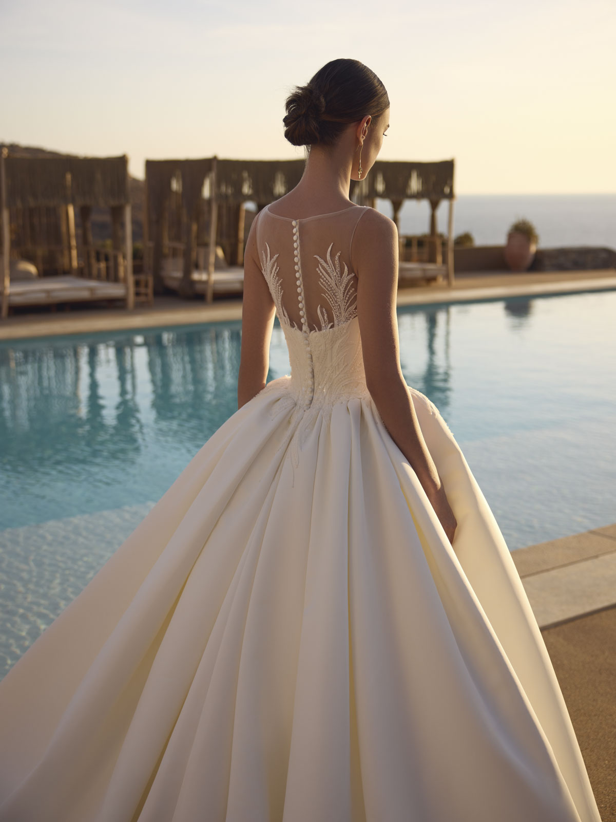 Haya es un espectacular vestido de satén mate que aporta elegancia y glamour a tu gran día. El escote ilusión crea un look romántico y etéreo, mientras que el encaje con cuentas que adorna el corsé añade la cantidad perfecta de brillo. Los tirantes fuera del hombro realzan su atractivo femenino, y la espalda de encaje ilusión completa el look con un toque suave y delicado.