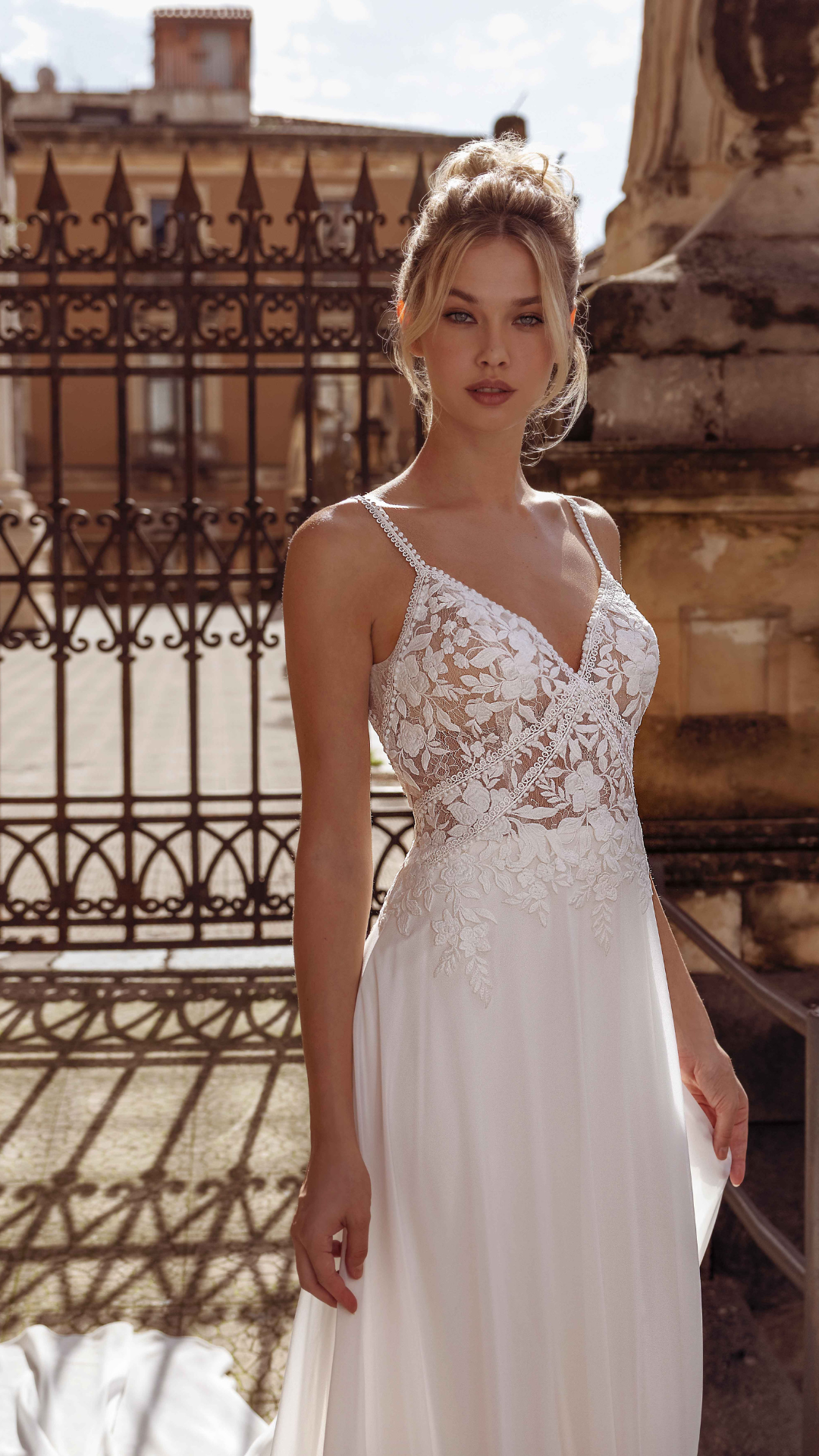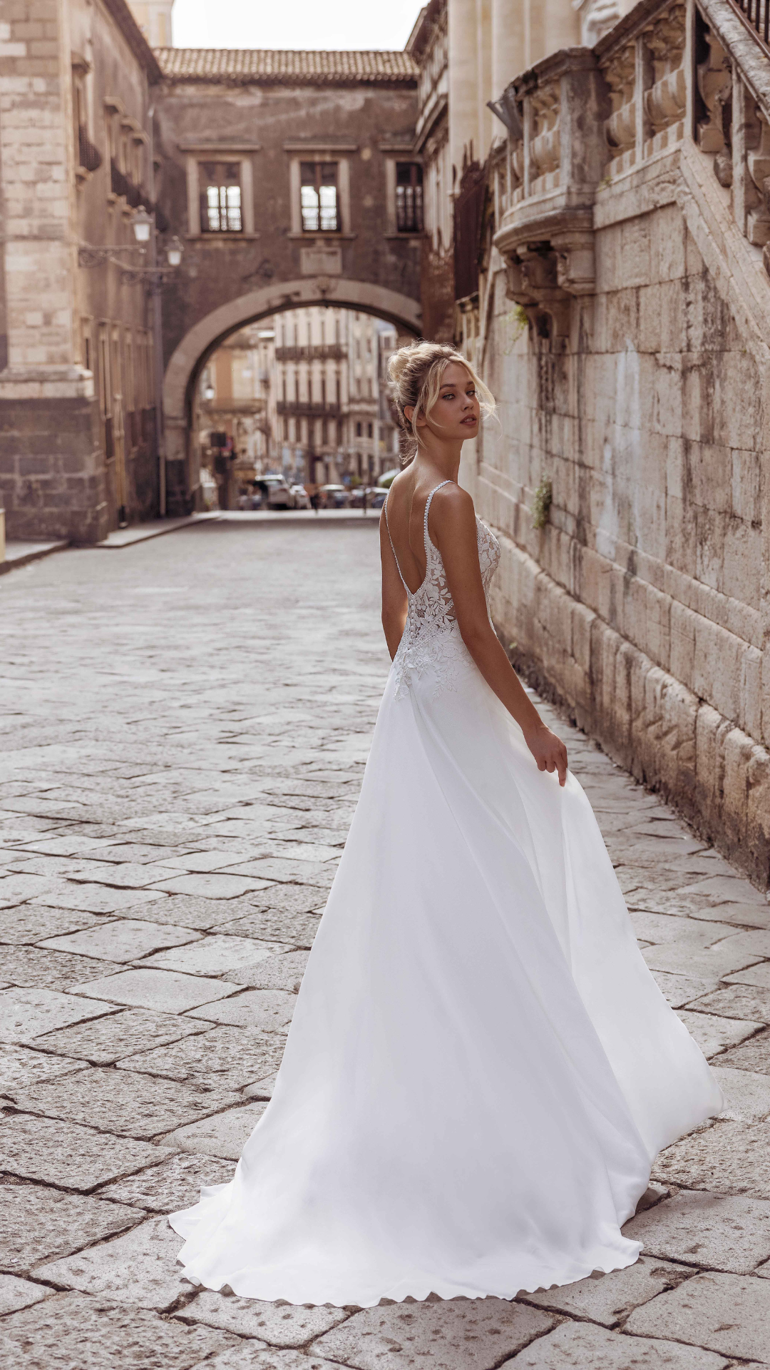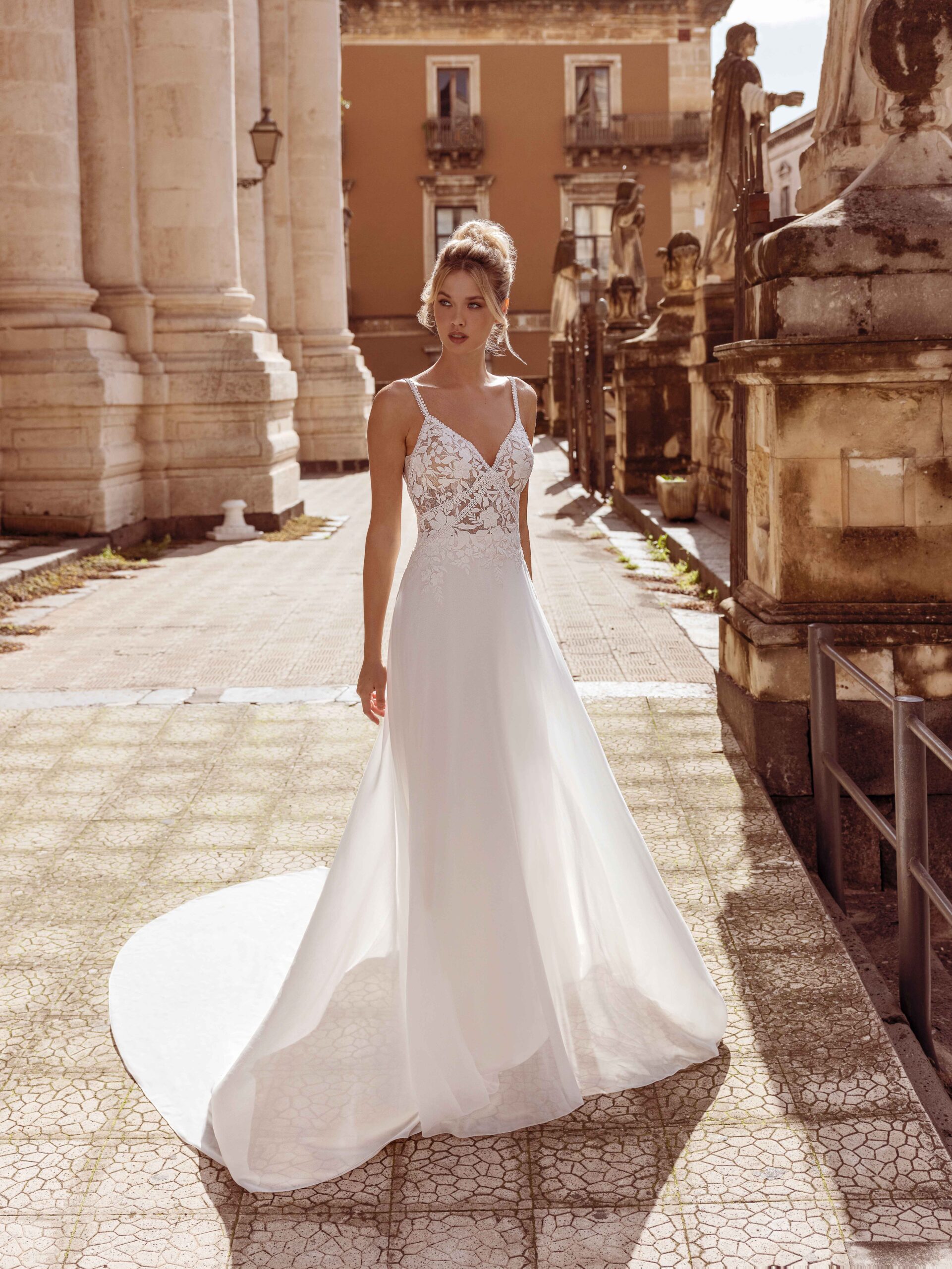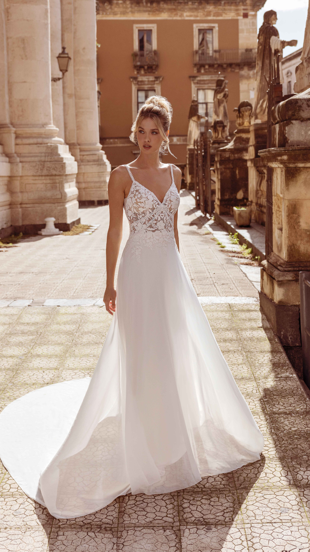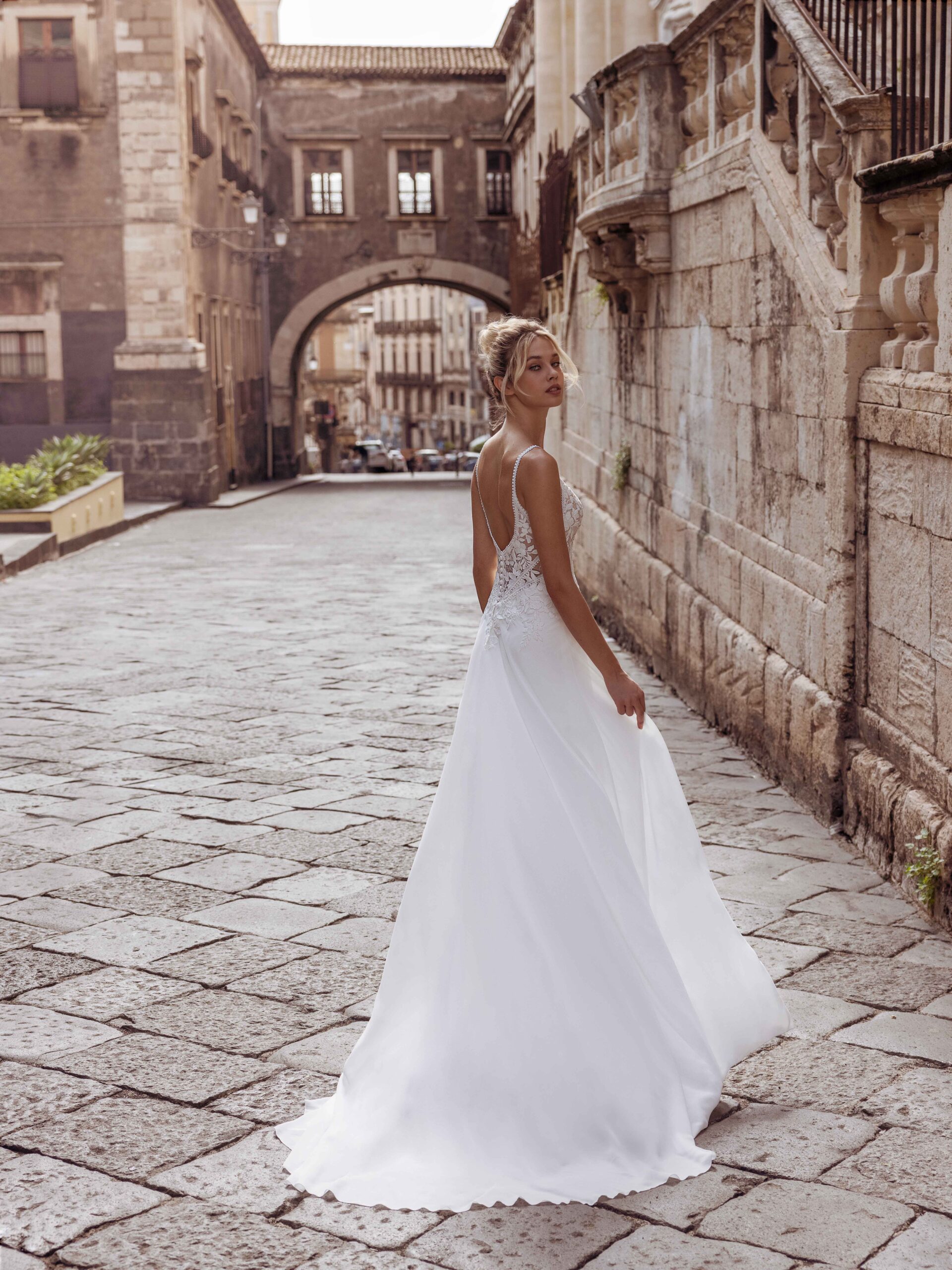 Percorrete la navata con lo splendido abito A-line Raji. Il corpetto in pizzo trasparente presenta un classico scollo a V e delicate spalline sottili. La schiena aperta rende questo abito femminile e sexy allo stesso tempo. La gonna in chiffon crea un movimento morbido, perfetto per la sposa che desidera un abito da sposa dalla forma leggera e semplice.