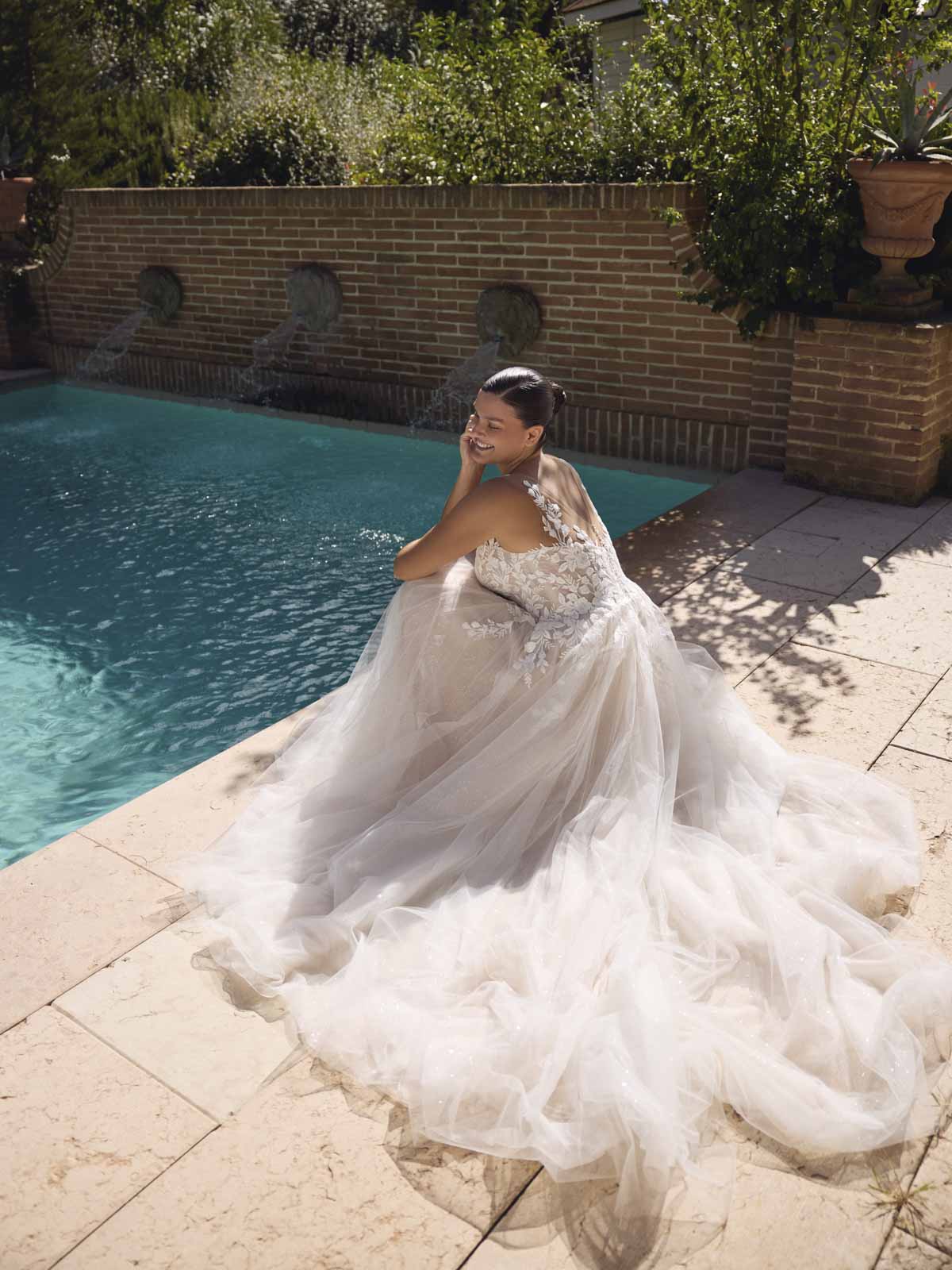 Romantiek wordt belichaamd in Jessie. Deze elegante A-lijn jurk heeft een illusie halslijn versierd met delicaat kant dat het lijfje perfect accentueert. De sprankelende tule rok voegt een vleugje verfijnde schittering toe, waardoor je schittert op je trouwdag. De illusion back creƫert een prachtig tattoo-effect en combineert klassieke schoonheid met een moderne twist.