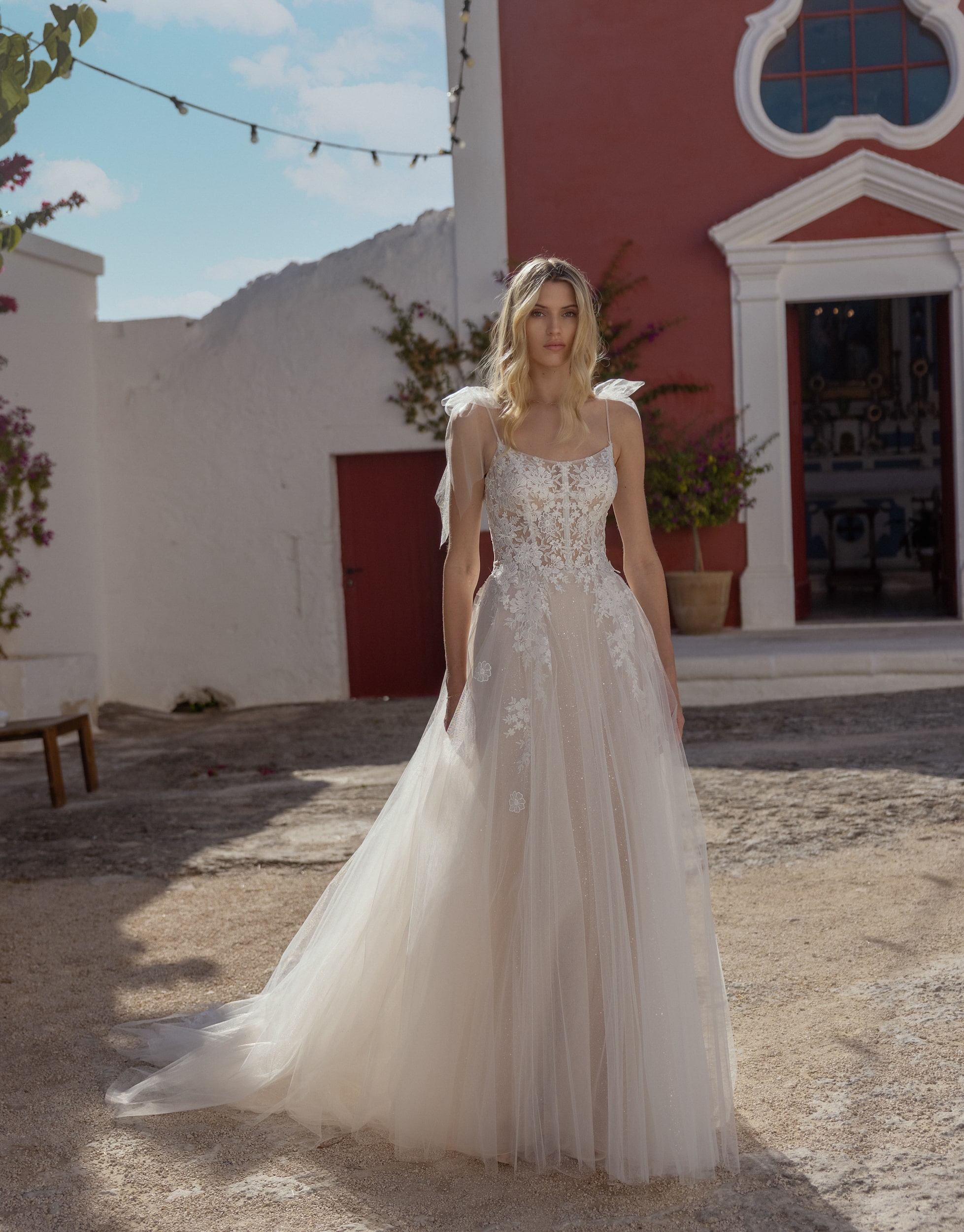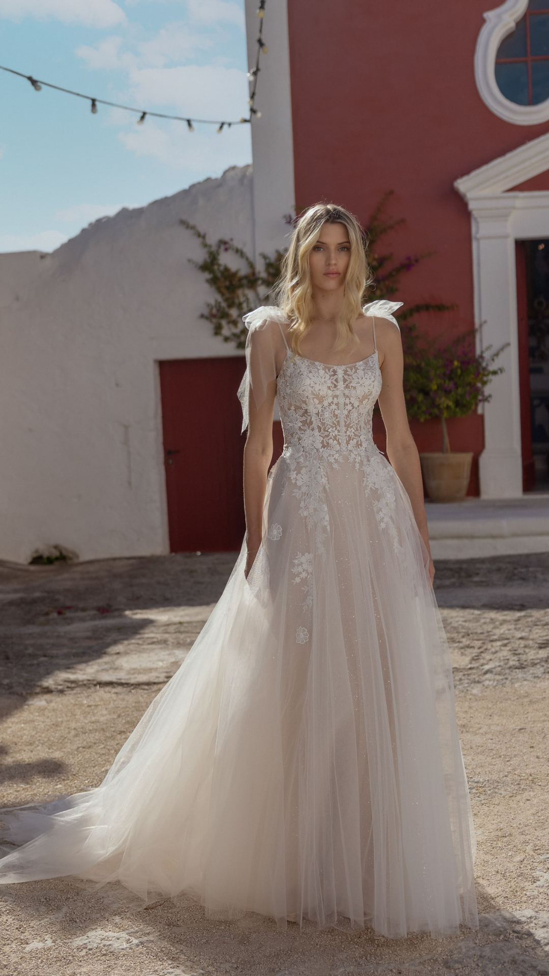 Dance on clouds in this effortlessly flowy A-line gown. The bodice is covered with flower motif lace which flows through in the tulle skirt. Delicate tulle bows adorn the thin straps adding a romantic touch to this gorgeous bridal gown.