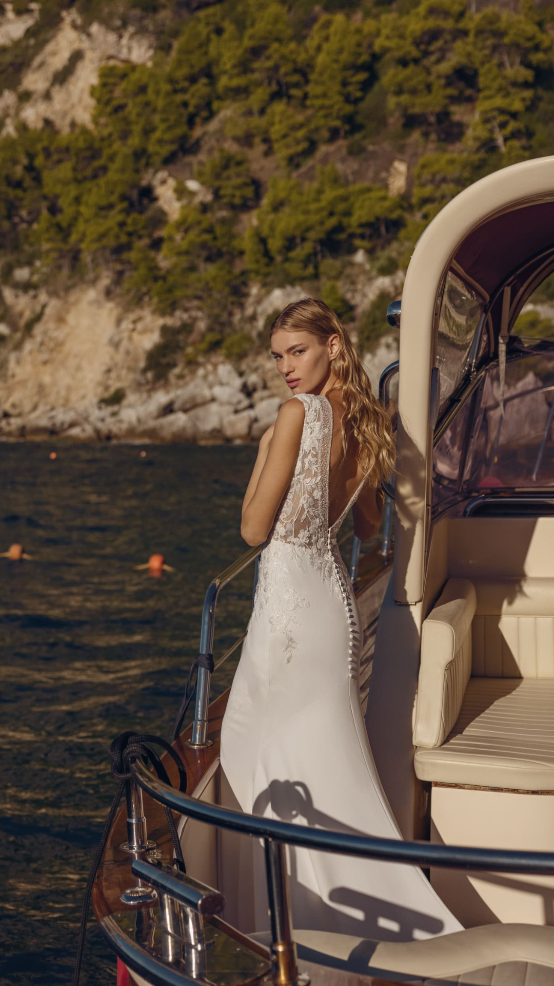Emphasize your shape in the fit and flare gown Baska. Beading throughout the illusion deep V-neckline and on the V back adds the perfect amount of sparkle to this bridal look. The illusion lace bodice matches perfectly with the fitted crepe skirt.
