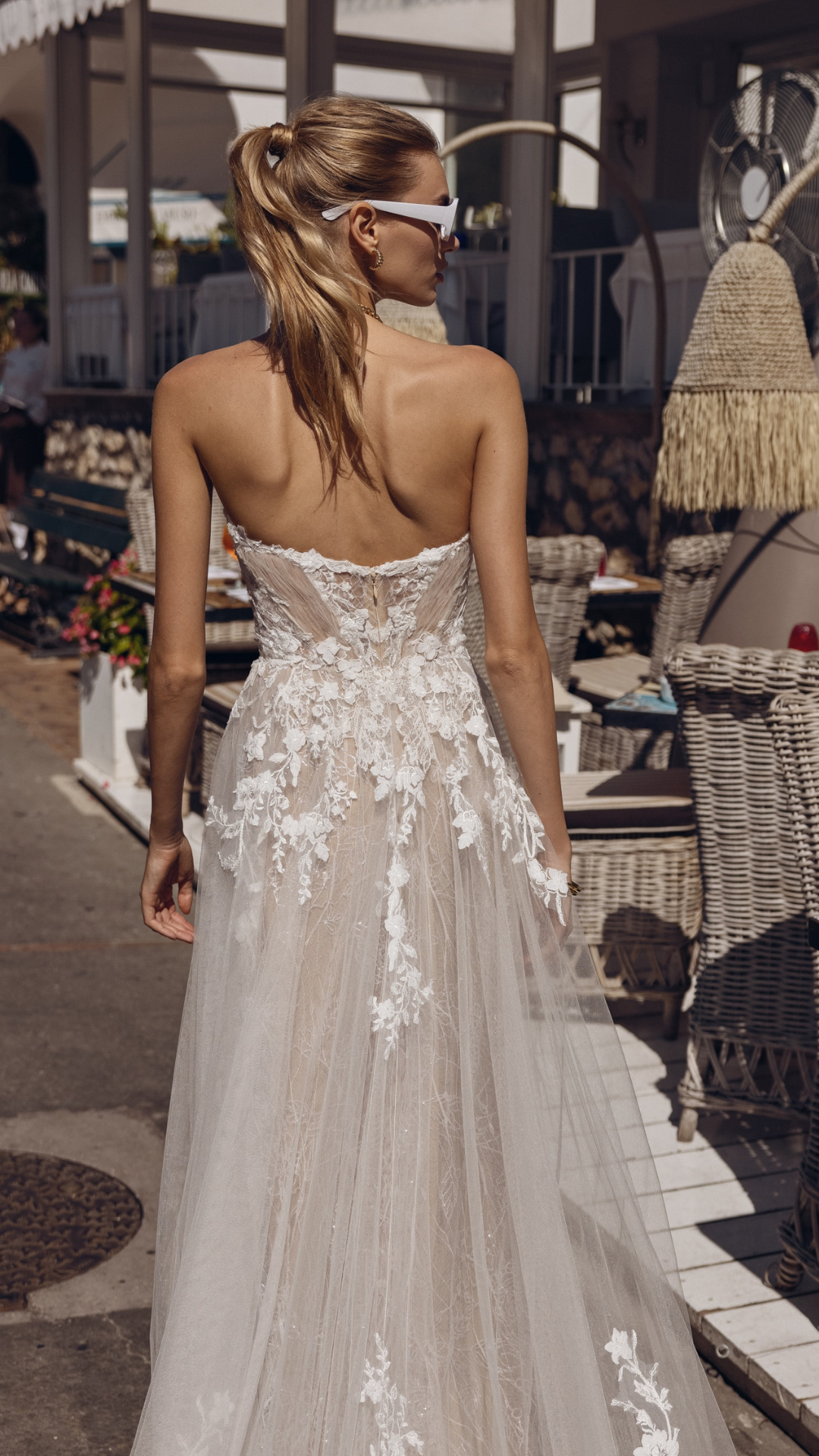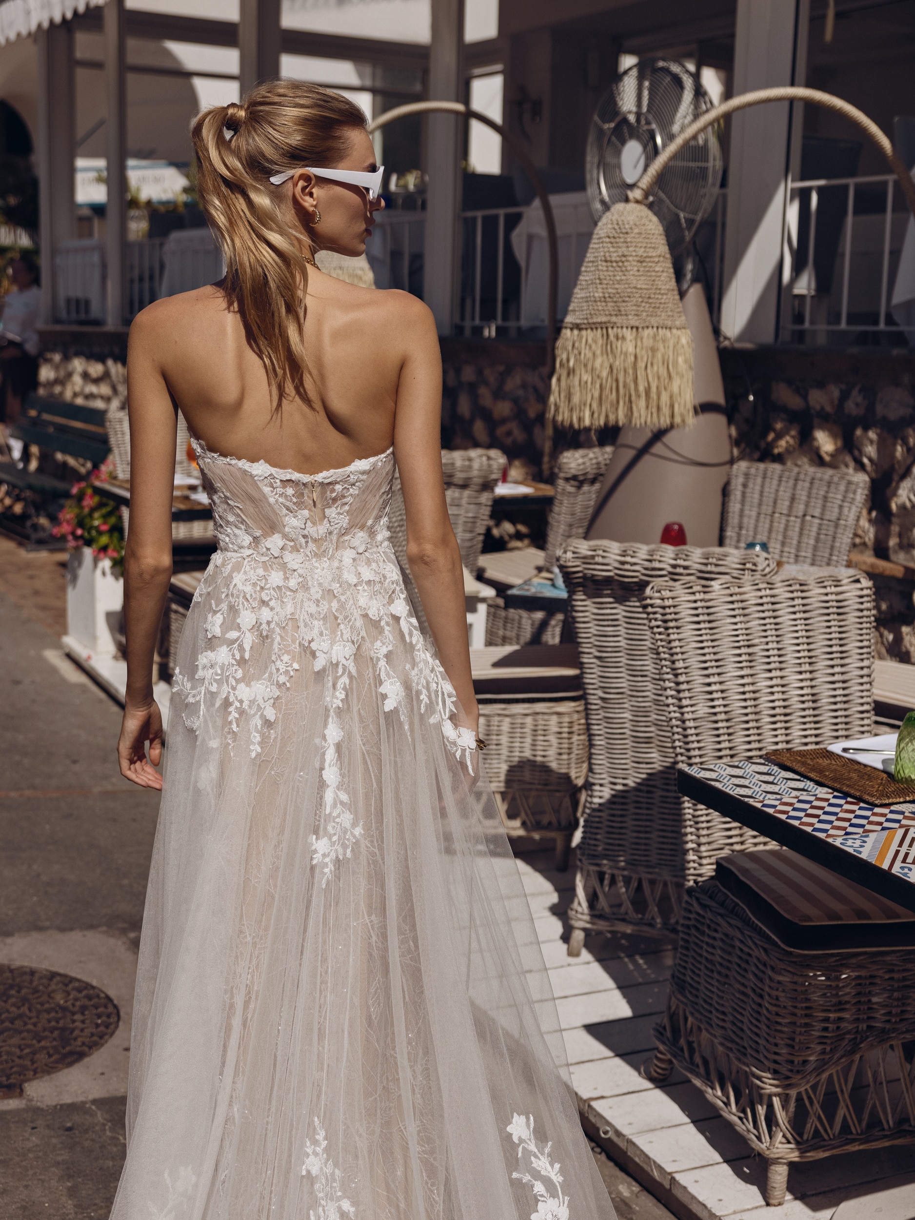 Fall in love with the beautiful wedding dress Benke. The classic strapless sweetheart neckline features an illusion bodice adorned with lace appliqués. The flowy tulle skirt with a split completes this look.