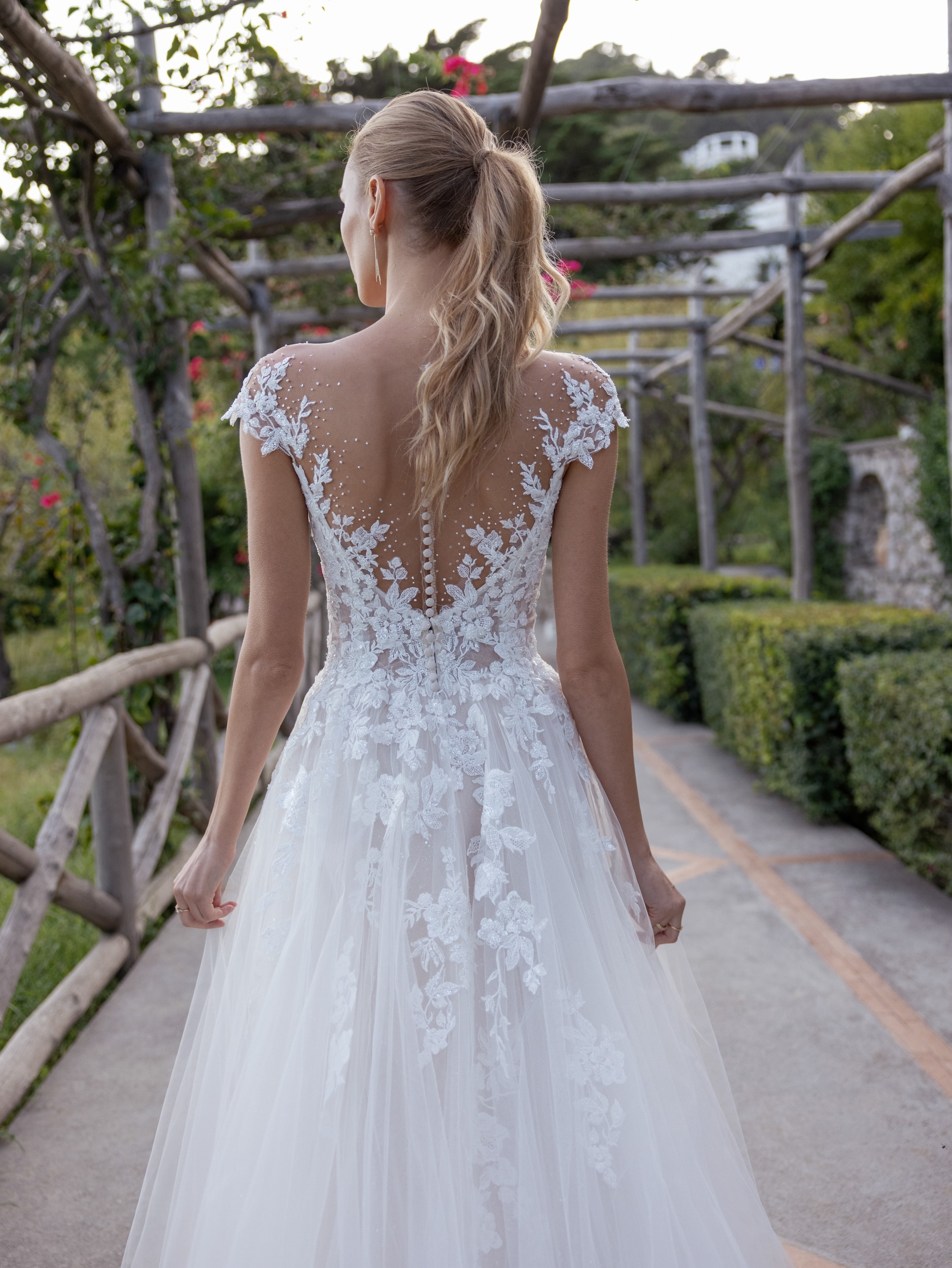 Create unforgettable memories in this flawless ballgown. The lace bodice features flattering cap sleeves and a stunning illusion neckline with sequins that will make you shine bright on your wedding day. The most striking feature of this gown is the sheer back with a classic row of buttons.