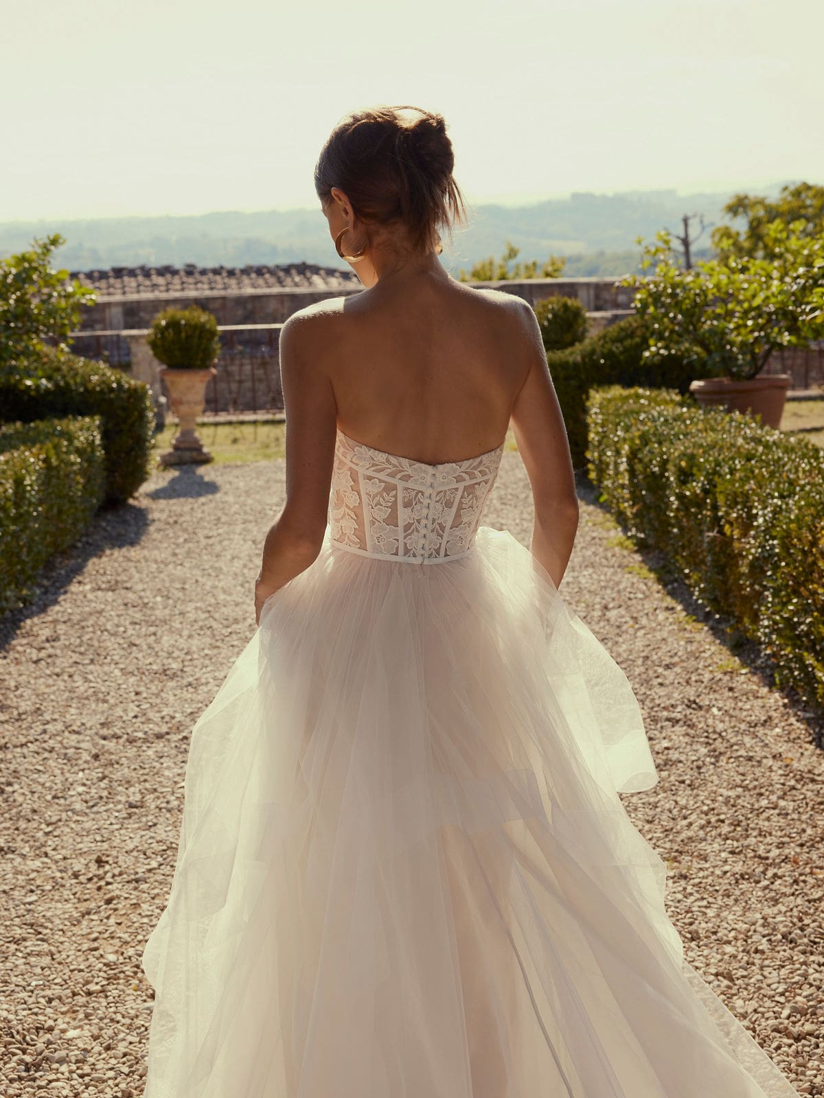 Dille is an impressive ballgown designed to steal the show on your special day. The mesmerizing lace bodice boasts a daring plunge sweetheart neckline and a dreamy ruffled organza skirt adds a joyful flair to this look. For a versatile touch, the detachable off-the-shoulder straps offer the option to switch up your look throughout your special day.