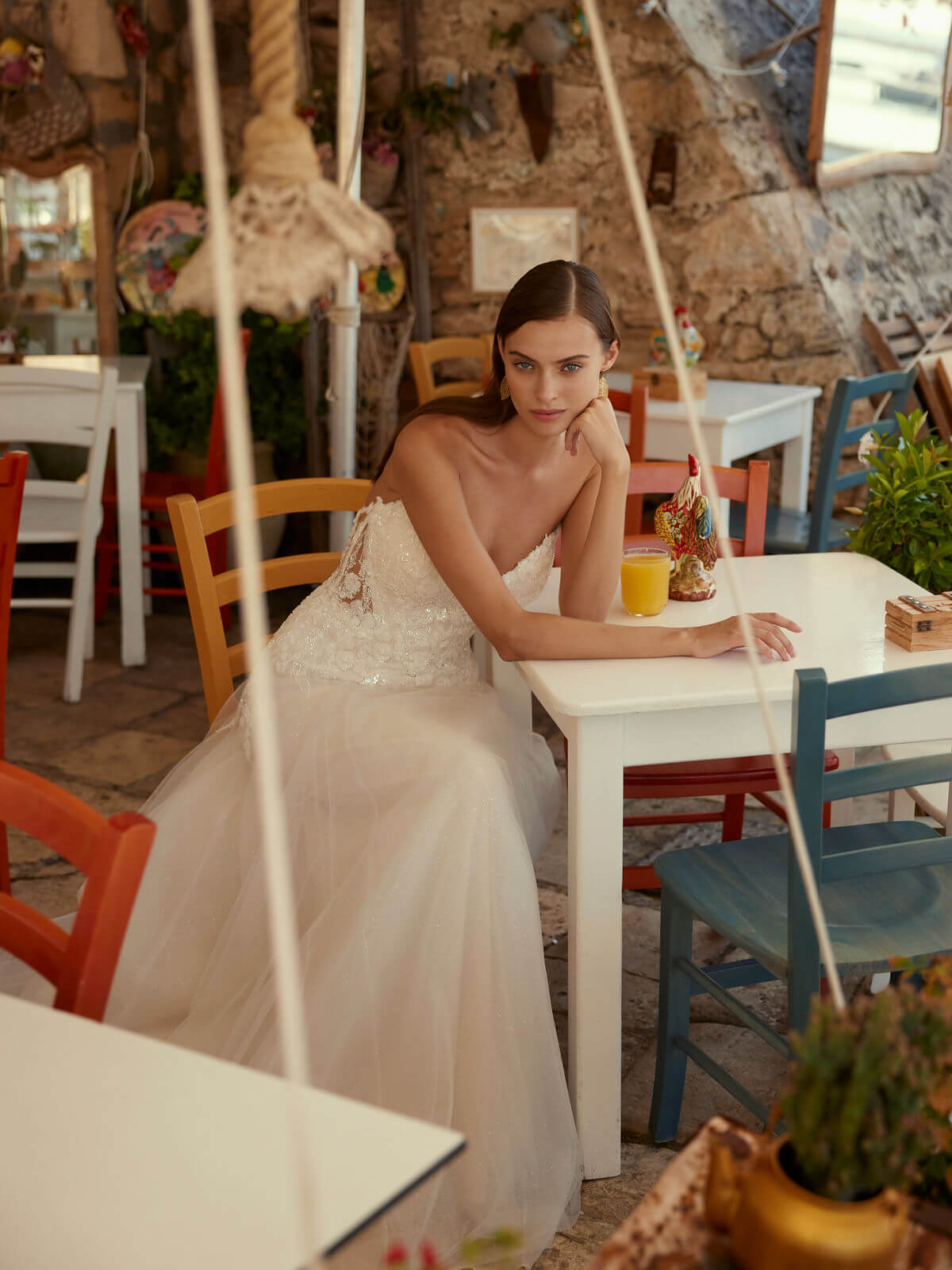 Elmyra is a stunning A-line gown with a sweetheart neckline and a stunning bodice adorned with sequined lace. The sparkling tulle skirt creates a dreamy silhouette fit for a modern day princess. Elmyra features detachable off-the-shoulder straps, allowing you to customize your look.