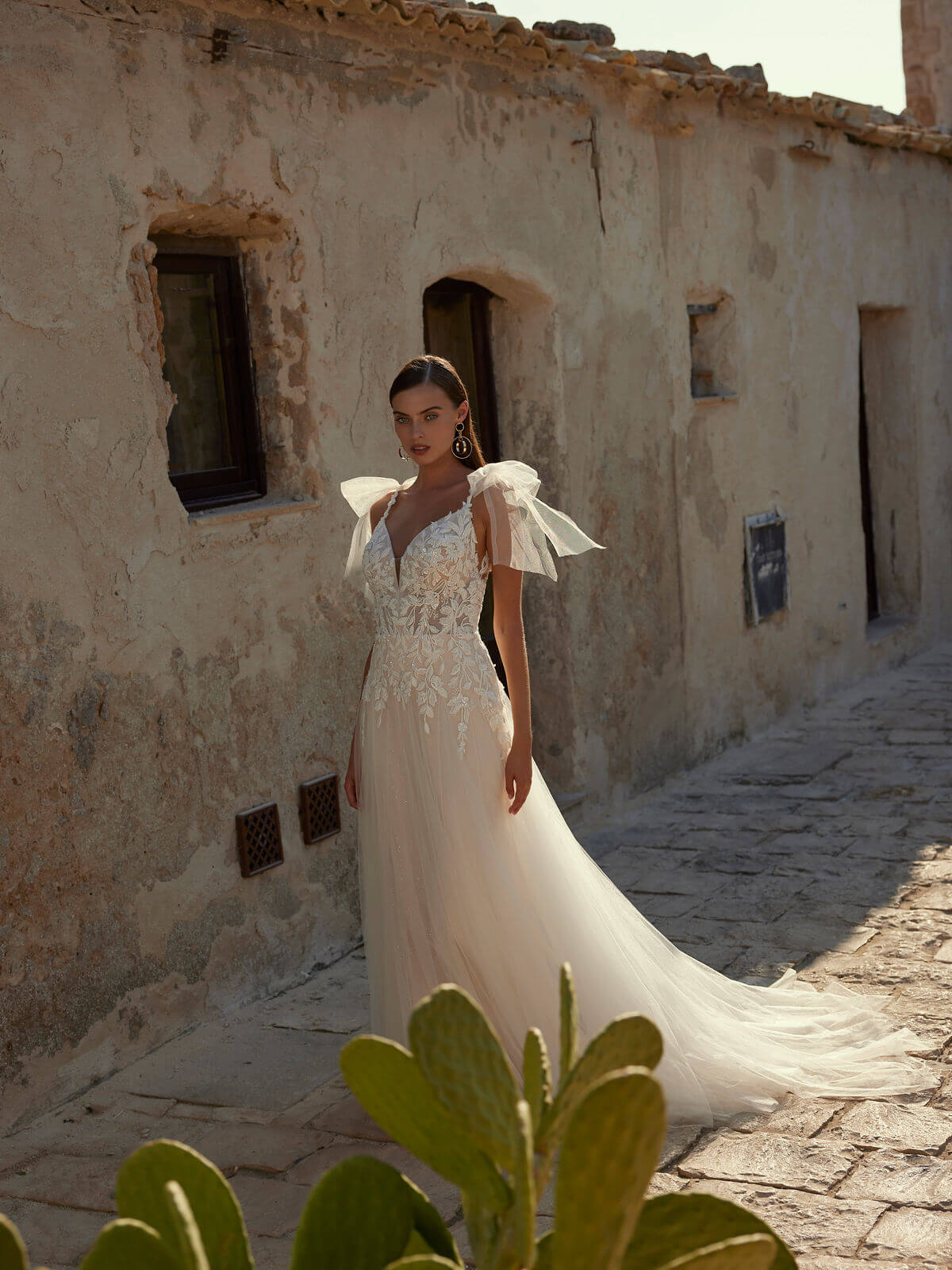 Eloise wedding gown is a vision of timeless romance and graceful elegance. This A-line silhouette gown boasts a sparkling tulle skirt and the bodice is adorned with delicate sequined lace. Charming tulle bows adorn the shoulders, lending a whimsical and romance charm to the style. This dress is also available with regular tulle – Eloise-A.