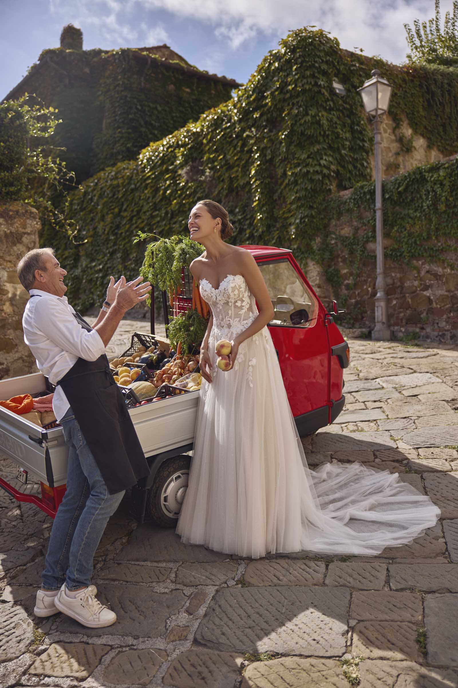 Geralyn is truly a dress that embodies effortless romance, with all the details a bride could ever want. This A-line strapless gown features a sweetheart neckline that perfectly complements the draped bodice, giving you a figure-flattering fit. Lace appliqués delicately adorn the bodice, cascading beautifully down to the sparkling tulle skirt, adding a touch of ethereal shimmer to your bridal look.