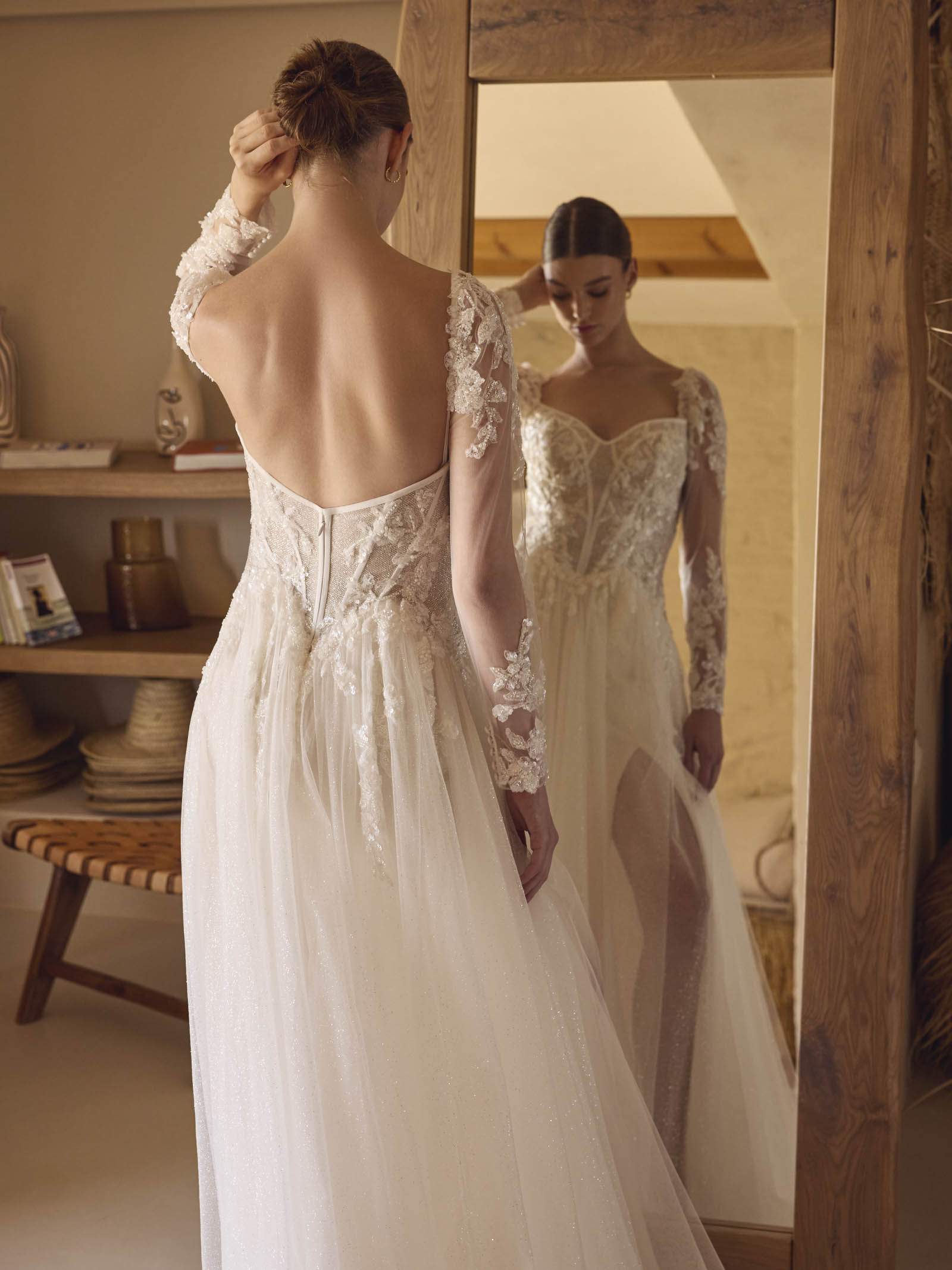 Hermine is an A-line sparkling tulle dress with a pointy neckline and beaded lace on the bodice. The design features a slit and detachable long sleeves. Also available without the sleeves as Hermine-D.