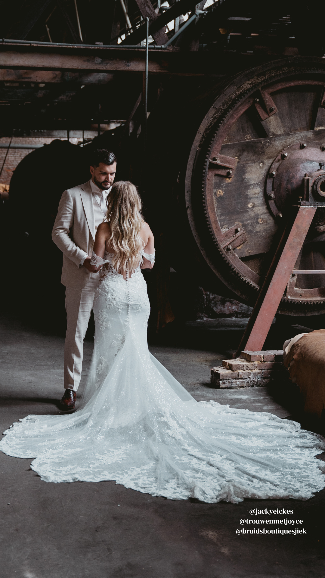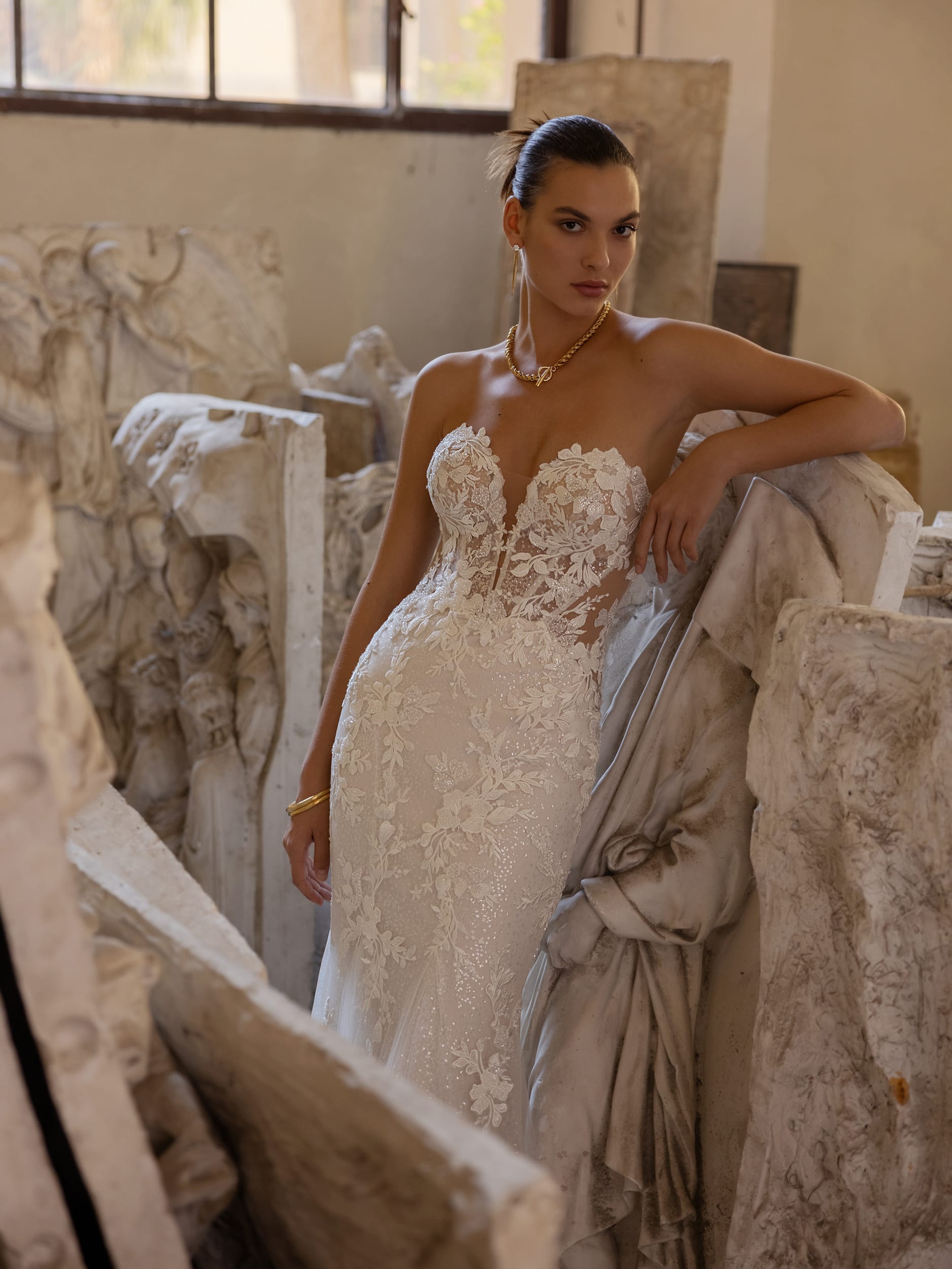 For the bride looking to make a statement, this fit and flare wedding dress is for you. Featuring a plunging sweetheart neckline, the strapless illusion bodice is embellished with sequined lace appliqués and a gorgeous embroidered sequin tulle underlay illuminates the complete gown. The wedding dress is finished with a chapel length train.
