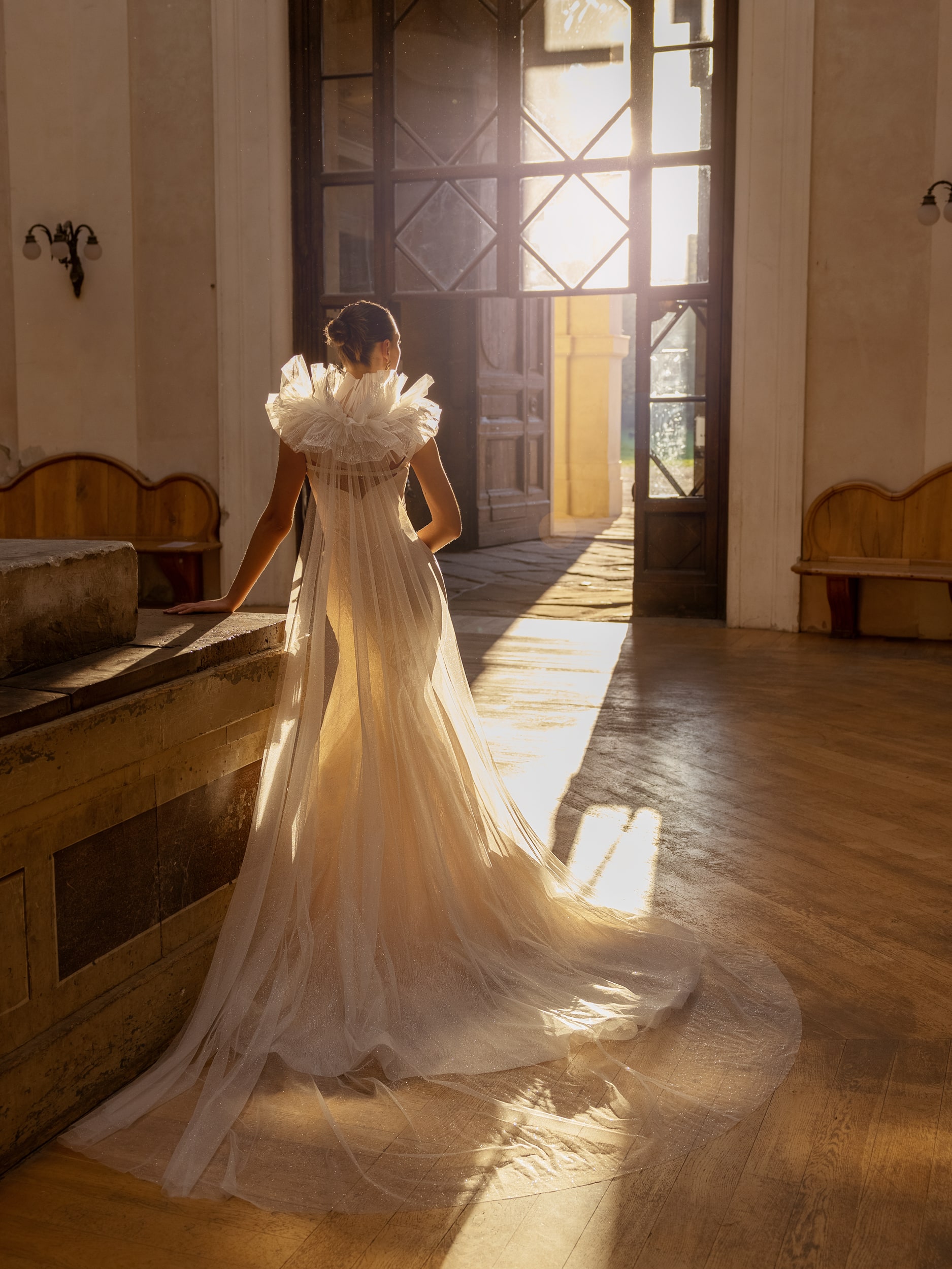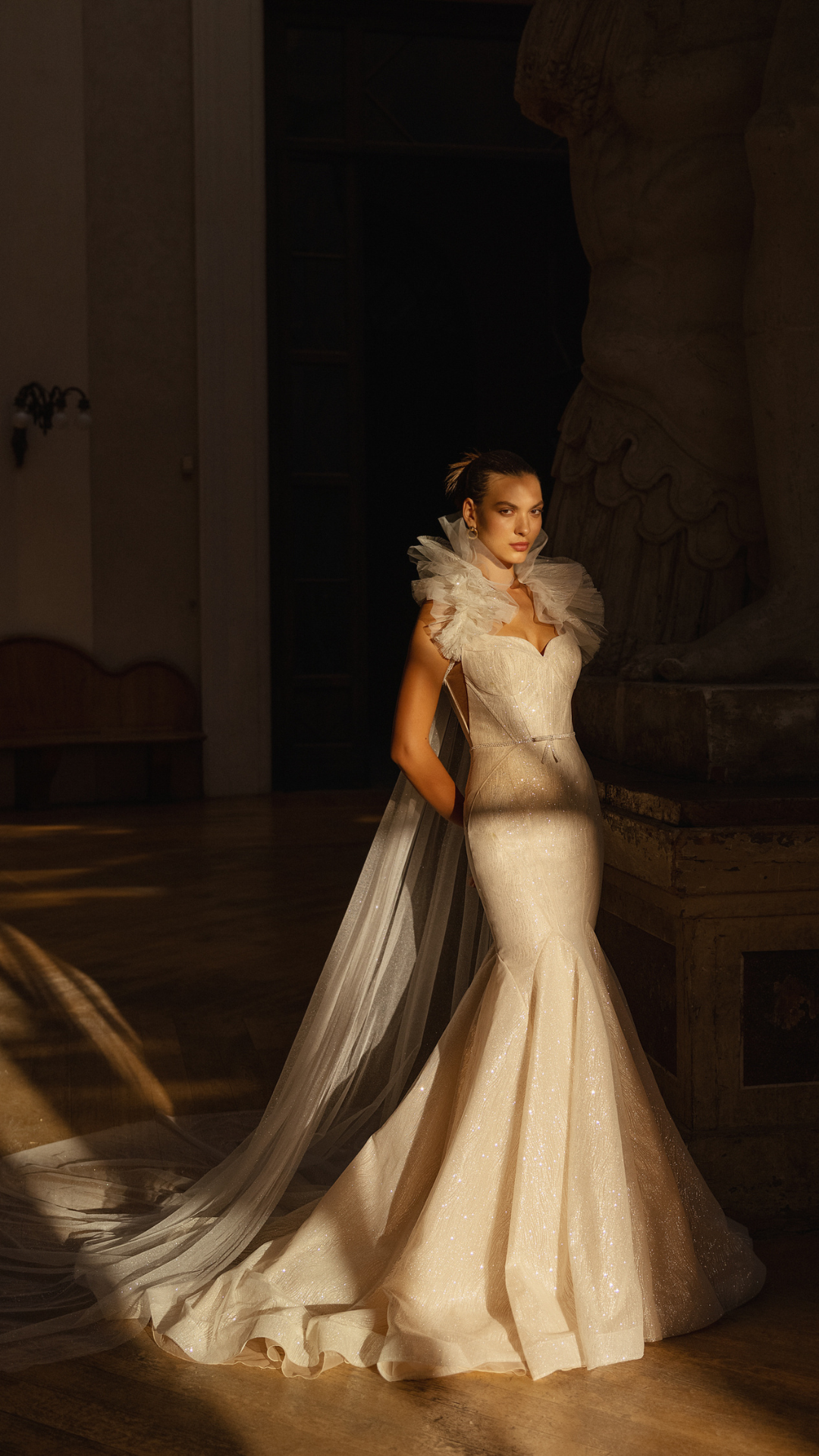 Be the star of the show with this beautiful and unique wedding gown. This jaw dropping mermaid dress with a subtle sweetheart neckline is the perfect choice for the luxurious and glamorous bride. The detachable bridal cape with a ruffled collar is a true eye-catcher.